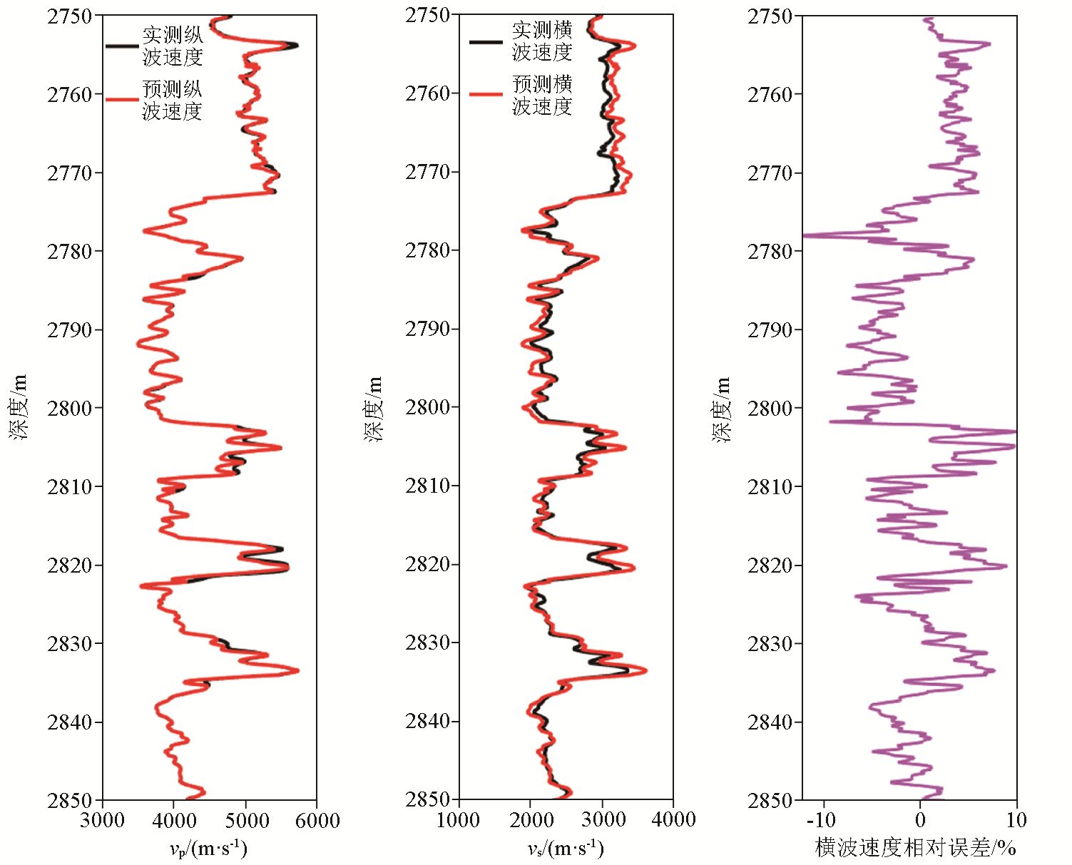 | 图8 A井纵横波实测结果和预测结果以及横波实测结果和预测结果的相对误差 |