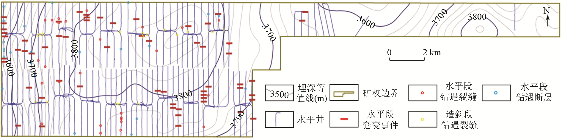 | Fig.1 Burial depth of the bottom of Longmaxi Formation in the study area and the results of fault and suite deformation events encountered in the horizontal section |