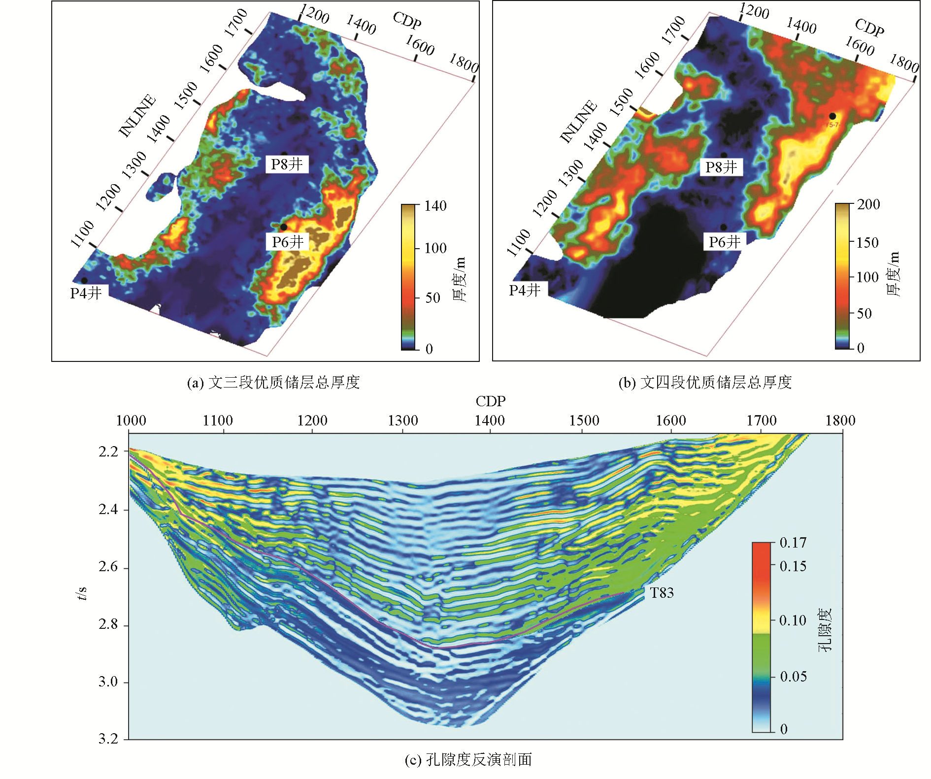 | 图13 文昌组优质储层总厚度图与孔隙度反演剖面 |