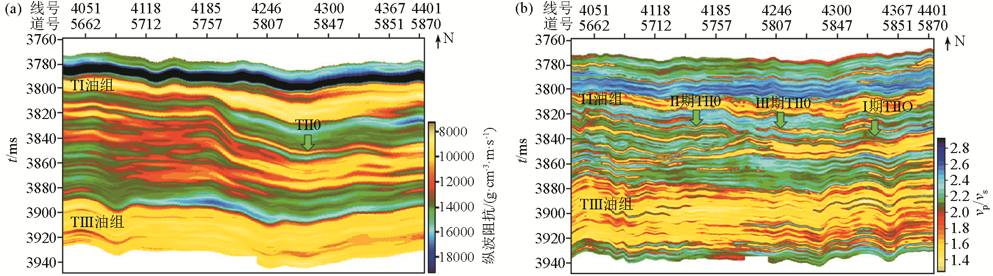 | 图10 不同方法反演剖面对比 a—常规反演剖面;b—叠前相控地质统计学反演剖面 |