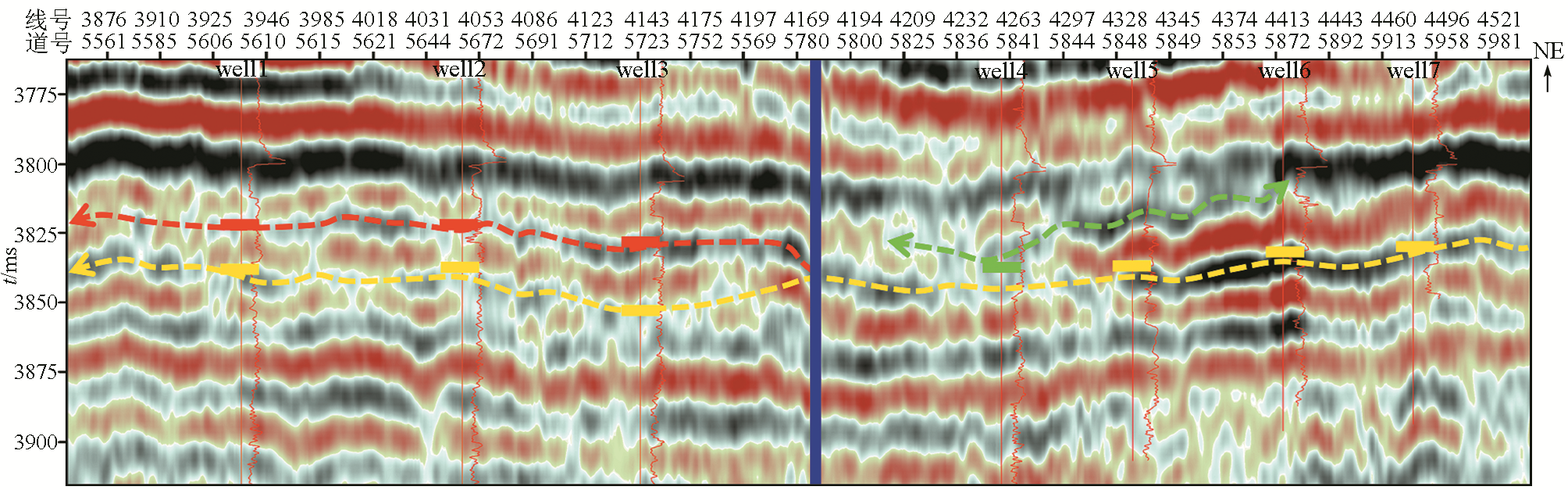| Fig.4 Seismic interpretation scheme corresponding to multi-stage sand body superposition model of TII0 small layer in Lunnan Triassic system |