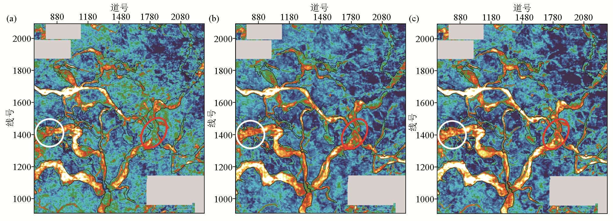 | 图10 渤海某砂体最小振幅值属性 a—仅应用A区块资料; b—仅应用B区块资料;c—应用两区块融合资料 |