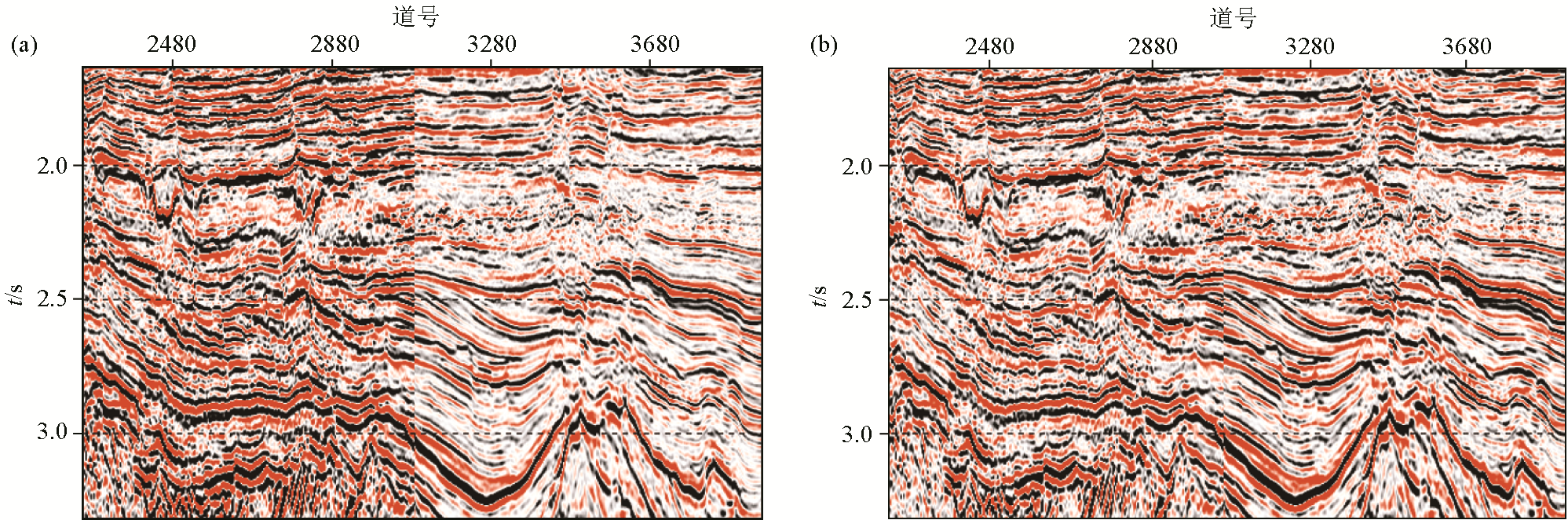 | 图3 振幅匹配前(a)、后(b)的拼接剖面对比 |