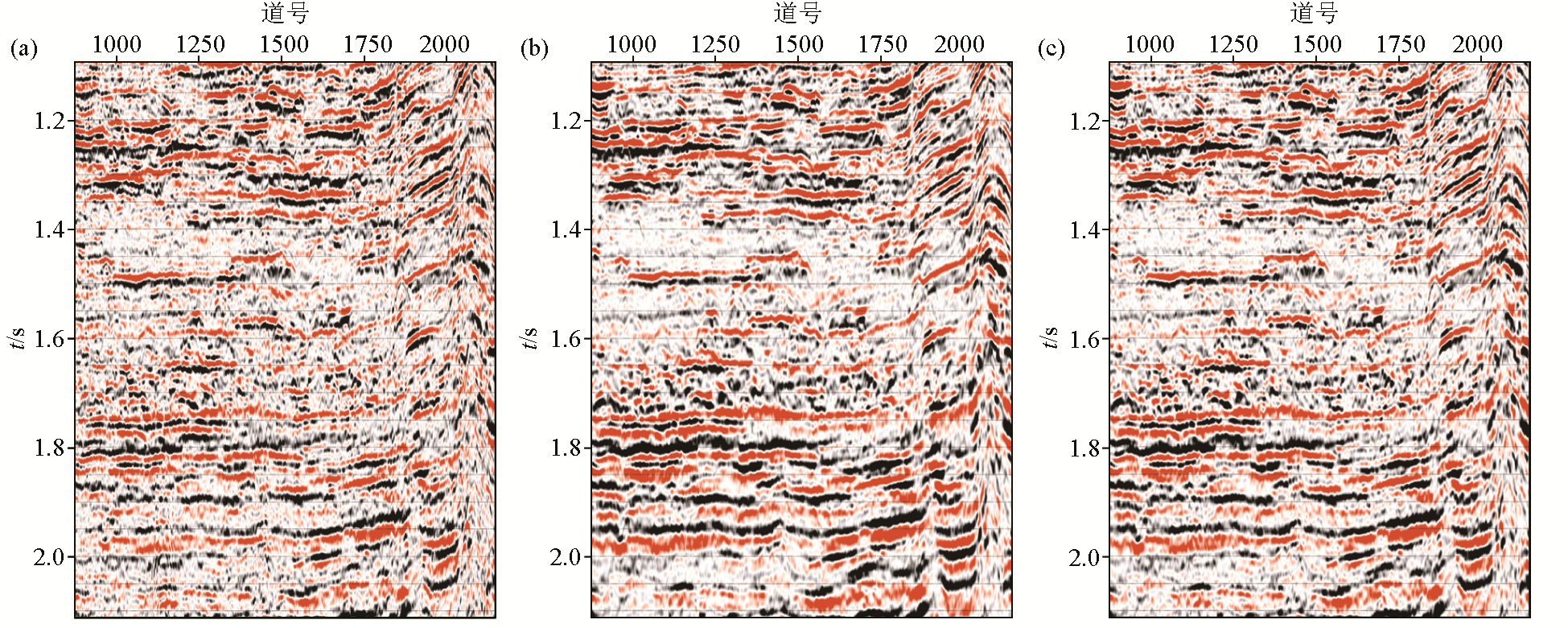 | 图7 3种拼接方案叠加剖面对比 a—仅应用A区块资料; b—仅应用B区块资料;c—应用两区块融合资料 |