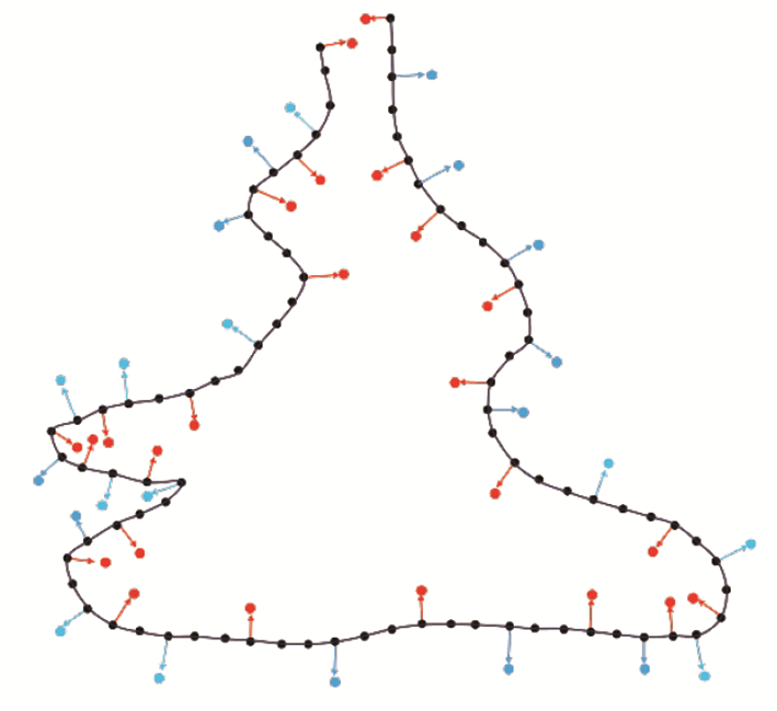 | 图3 控制点二维示意(红色代表模型内部控制点,蓝色代表模型外部控制点) |