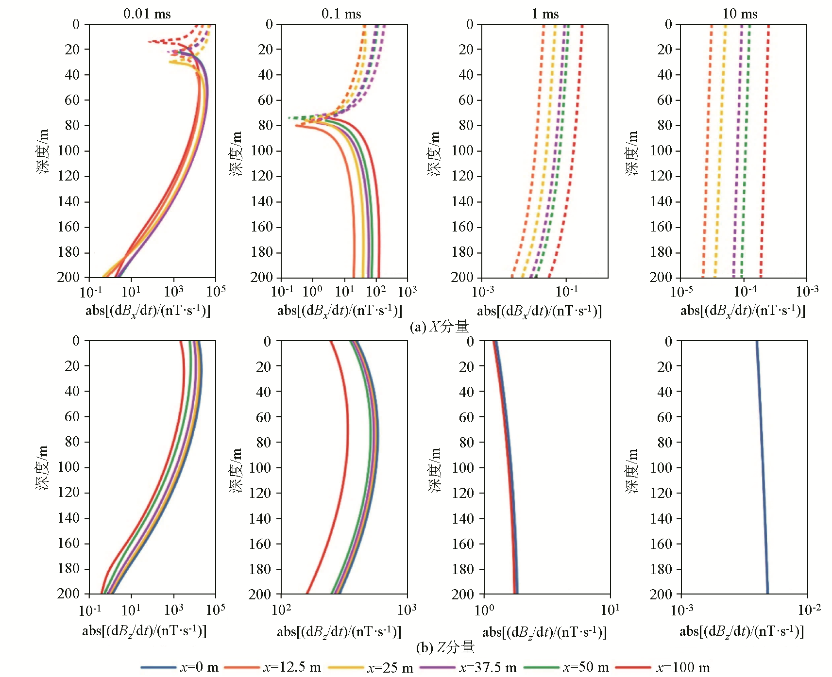 | 图8 不同井偏移距的X、Z分量响应曲线(虚线代表符号为负) |