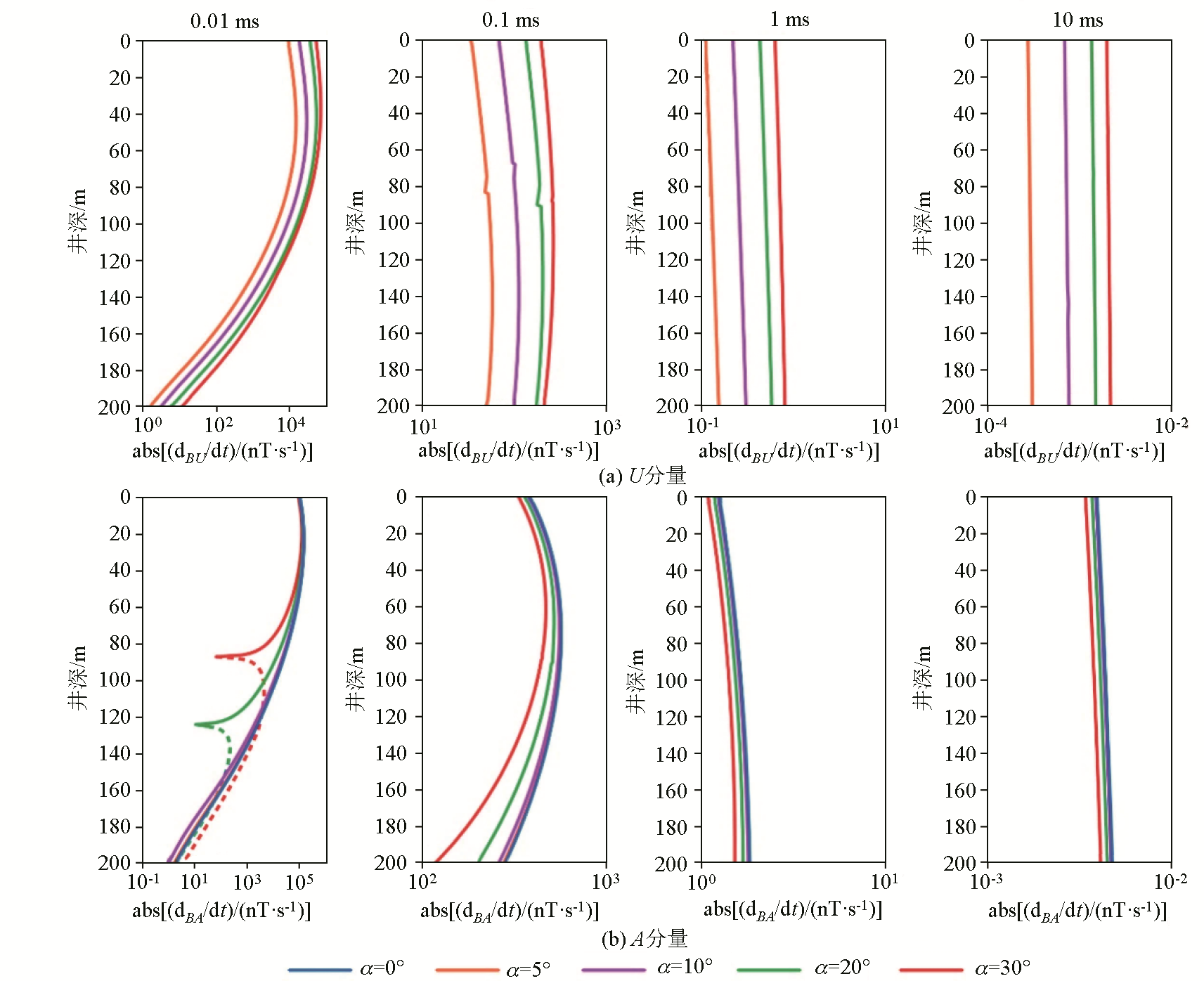 | 图9 不同井斜的U、A分量响应曲线 (虚线代表符号为负) |