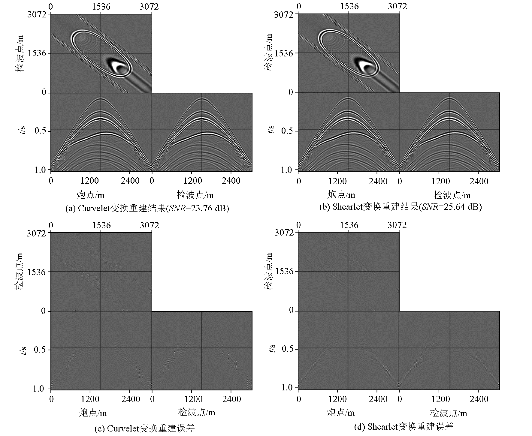 | 图3 Curvelet变换和Shearlet变换重建结果及其误差 |