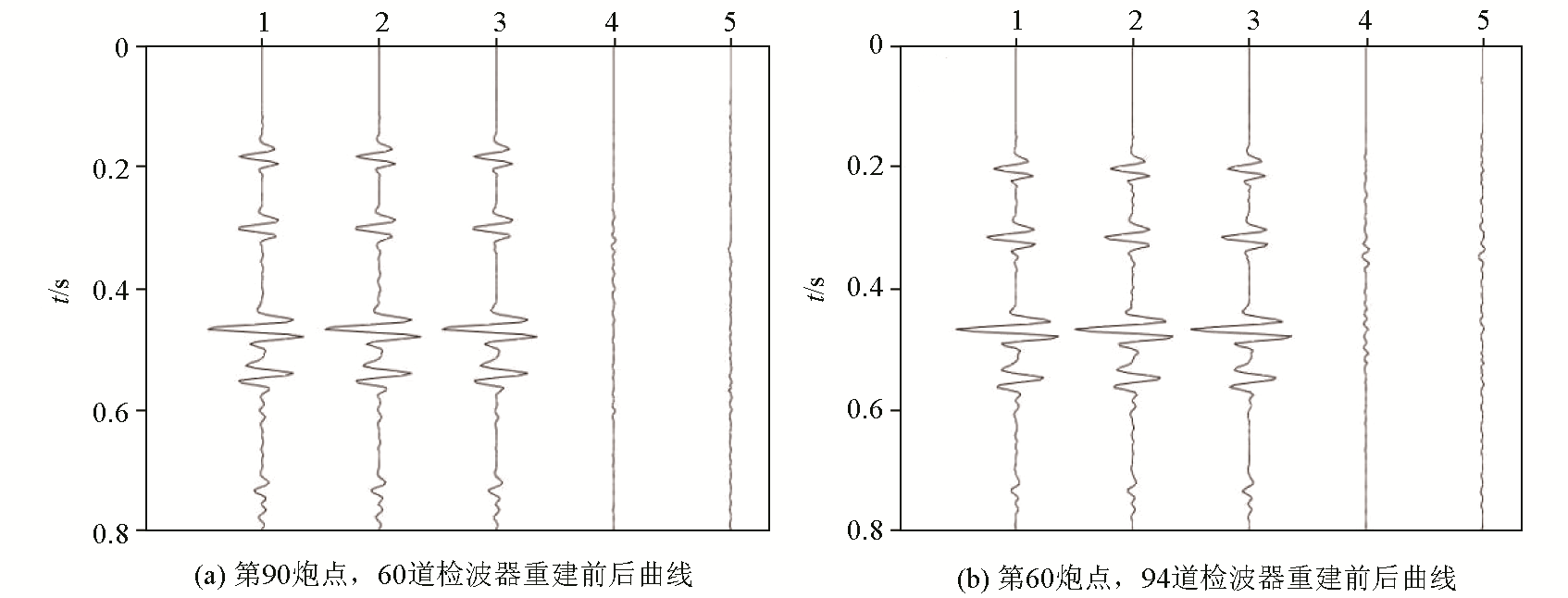 | 图6 重建结果与误差的单道显示 1—原始记录;2—Curvelet变换重建曲线;3—Shearlet变换重建曲线;4—Curvelet变换的误差曲线;5—Shearlet变换的误差曲线 |