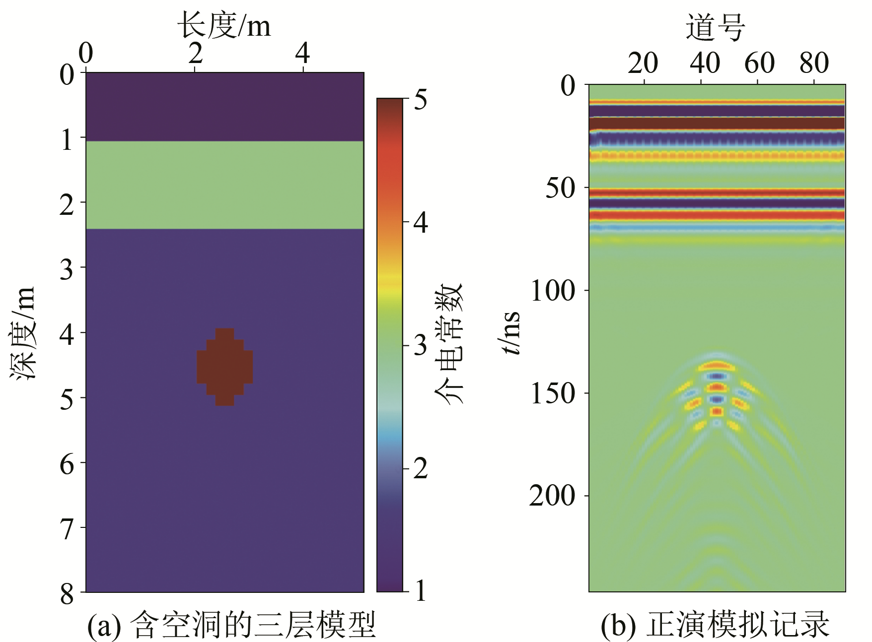 | 图2 探地雷达地质模型及其正演记录 |