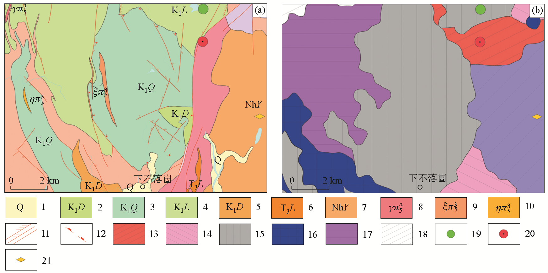 | Fig.3 Geological sketch map (a) and factor analysis contrast map (b) of Xiabuluogu area in the study area 1—Quaternary system; 2—lower Cretaceous Dasheng Group; 3—lower Cretaceous Qingshan Group; 4—lower Cretaceous Laiyang Group; 5—early Cretaceous Dadian sequence; 6—late Triassic Liulinzhuang sequence; 7—Neoproterozoic Yuejishan sequence; 8—granite porphyry vein; 9—syenite porphyry vein; 10—monzonitic porphyry vein; 11—compression torsion fracture/tension torsion fracture/fracture of unknown nature; 12—volcanic institutions; 13—F1(Co-Mn-Ti-V) partition; 14—F2 (Au-Ag-Mo-Cu-Bi) partition; 15—F3(Cr-Ni) partition; 16—F4(Pb-Zn) zoning; 17—F7(Hg) zone; 18—mixed factor zoning; 19—copper mine; 20—iron ore point; 21—potash occurrences |