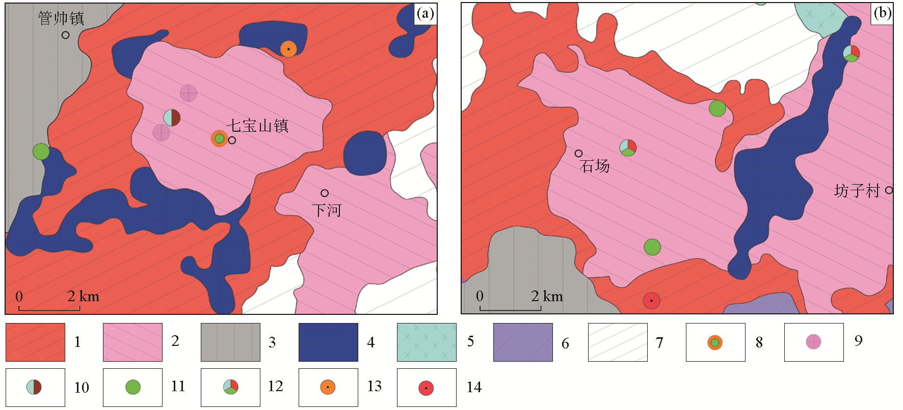 | 图4 七宝山金铜及外围多金属矿床F2-F4-F1因子成矿模型(a)及石场—坊子村地区F2-F4-F1因子成矿预测(b) 1—F1(Co-Mn-Ti-V)分区;2—F2(Au-Ag-Mo-Cu-Bi)分区;3—F3(Cr-Ni)分区;4—F4(Pb-Zn)分区;5—F6(Sn)分区;6—F2+F4分区;7—混合因子分区;8—七宝山金铜矿;9—七宝山外围银矿;10—七宝山外围铅锌矿;11—铜矿点;12—多金属矿点;13—黄铁矿;14—铁矿点 |