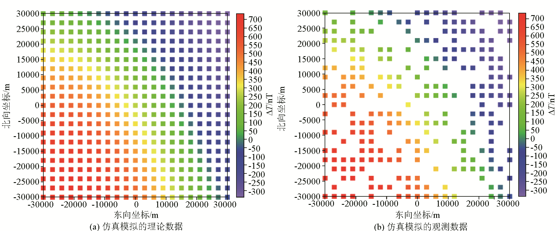 | 图1 仿真模拟的理论数据(a)与仿真模拟的观测数据(b) |
