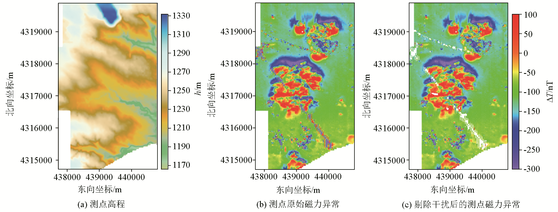 | 图9 磁力测点高程(a)、原始ΔT磁力异常数据(b)与剔除干扰之后的ΔT磁力异常数据(c) |