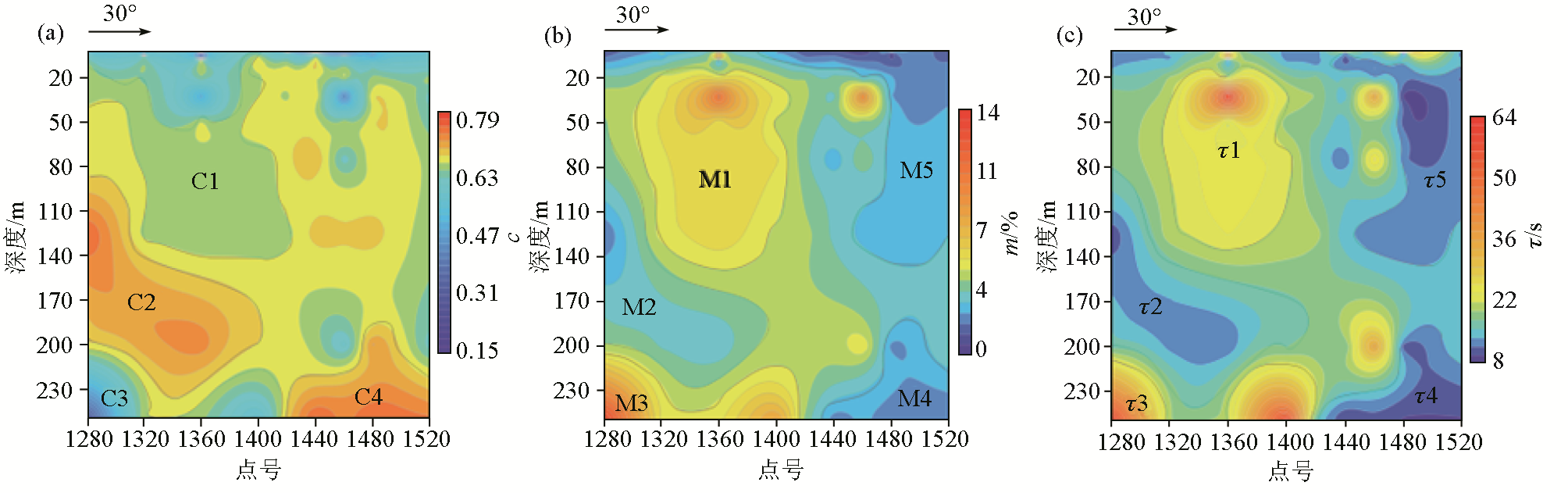 | 图11 实测数据代入BP神经网络中训练与预测反演频谱参数等值线图:(a)频率相关系数、(b)充电率、(c)时间常数 |