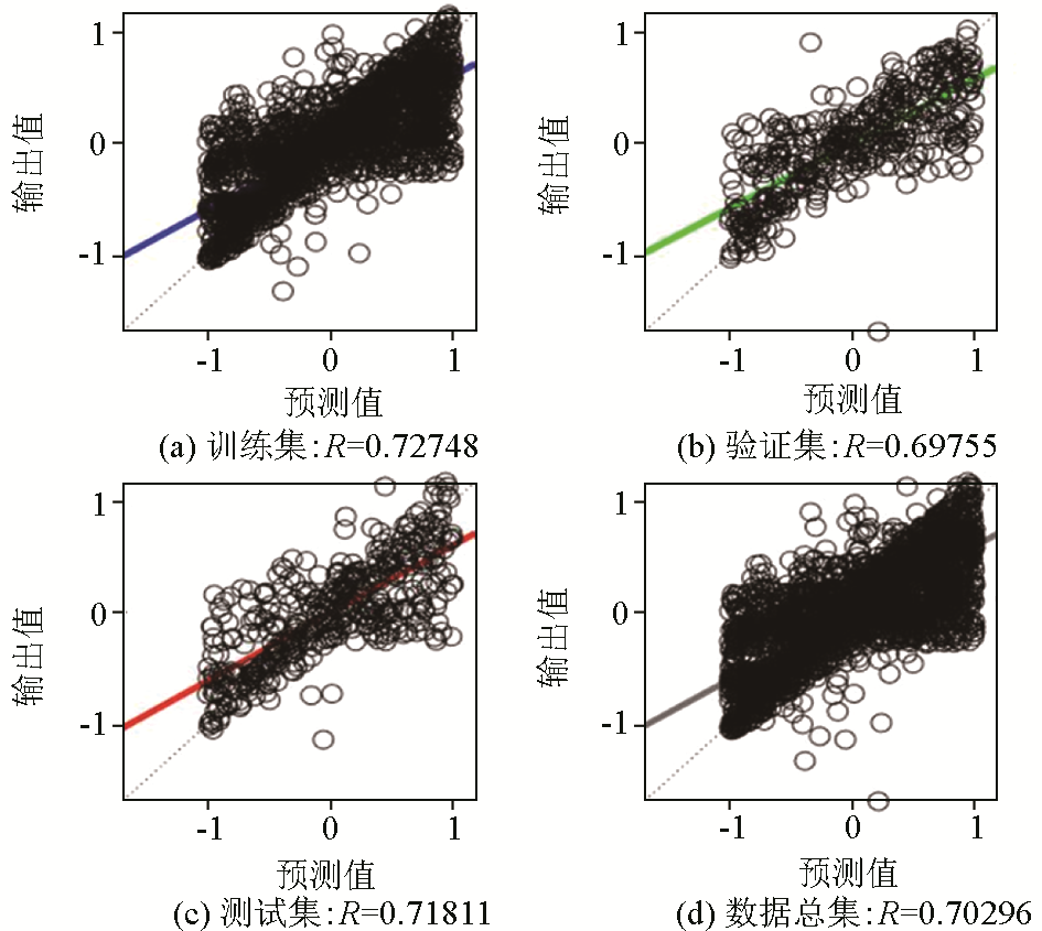 | Fig.3 Regression curves for the training set(a)、validation set(b)、testing set (c) and total dataset(d) of Model 3-[5]-3 structure |
