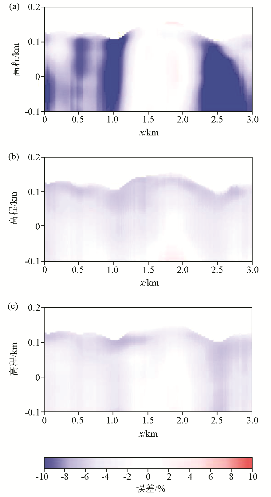 | 图3 y=1 km处的速度相对误差切片 a—基于水平地表假设的初至走时层析反演模型相对误差;b—菲涅尔体初至走时层析反演模型相对误差;c—本文方法反演模型相对误差 |