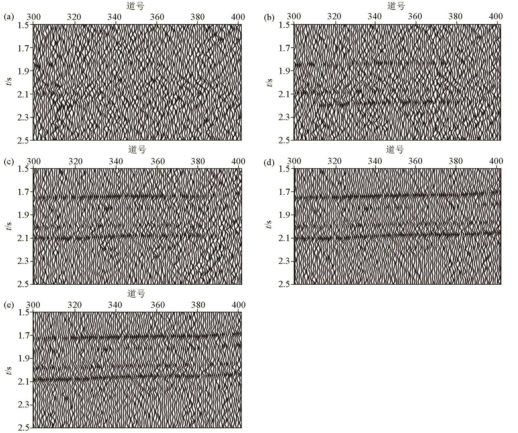 | 图8 静校正处理后的第75条CMP线叠加剖面 a—未做静校正的叠加剖面;b—高程校正后的叠加剖面;c—基于水平地表假设的初至走时层析速度模型进行长波长静校正后的叠加剖面;d—菲涅尔体初至走时层析速度模型进行长波长静校正后的叠加剖面;e—本文方法建立的速度模型进行长波长静校正后的叠加剖面 |