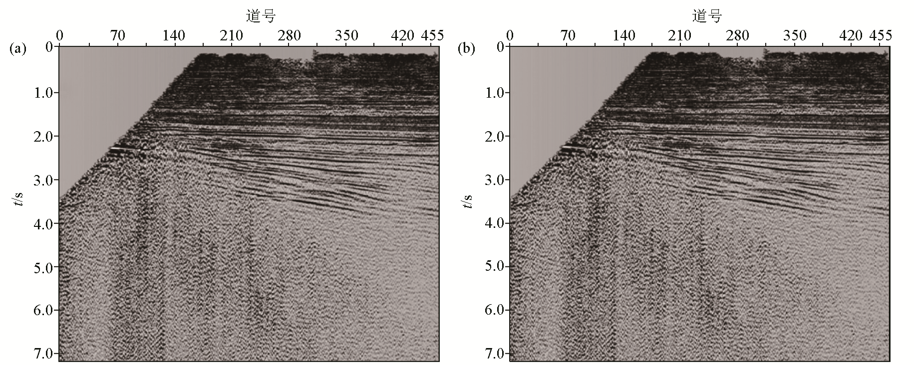 | 图14 共接收点道集(a)与共炮点道集(b)CMP叠加剖面对比 |