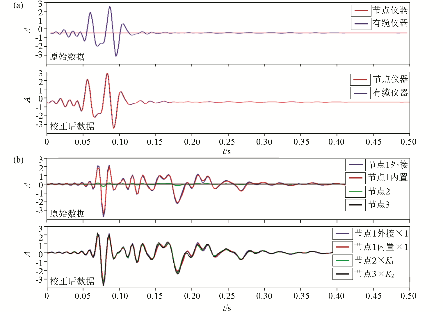 | 图6 不同地震仪采集数据校正前后对比 a—有缆仪器与节点仪器;b—两种节点仪器 |