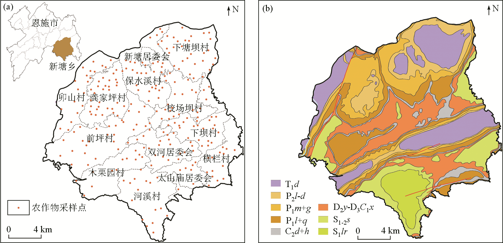 | 图1 新塘乡采样点分布(a)及地层分布(b)[ |