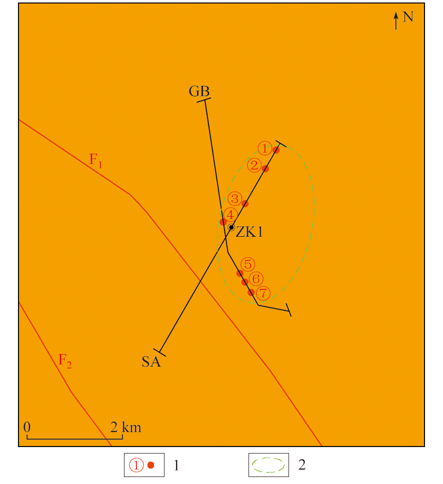 | Fig.10 Interpretation of geogas inference in the survey area 1—U anomalous peak location and number; 2—U prospecting sign area(the other legends have the same meaning as |