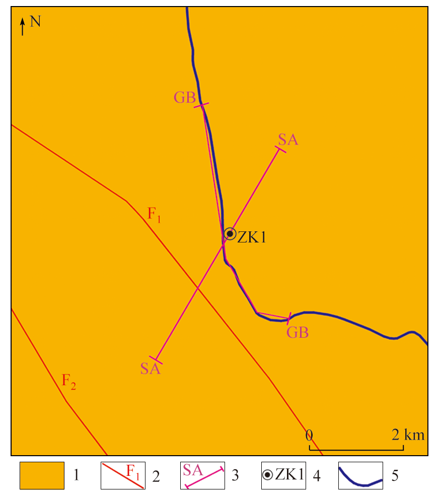 | 图5 塔里木某铀矿勘查区地质与地气工程部署 1—第四系风成沙;2—断裂与编号;3—测线位置与编号;4—钻孔位置与编号;5—简易公路 |