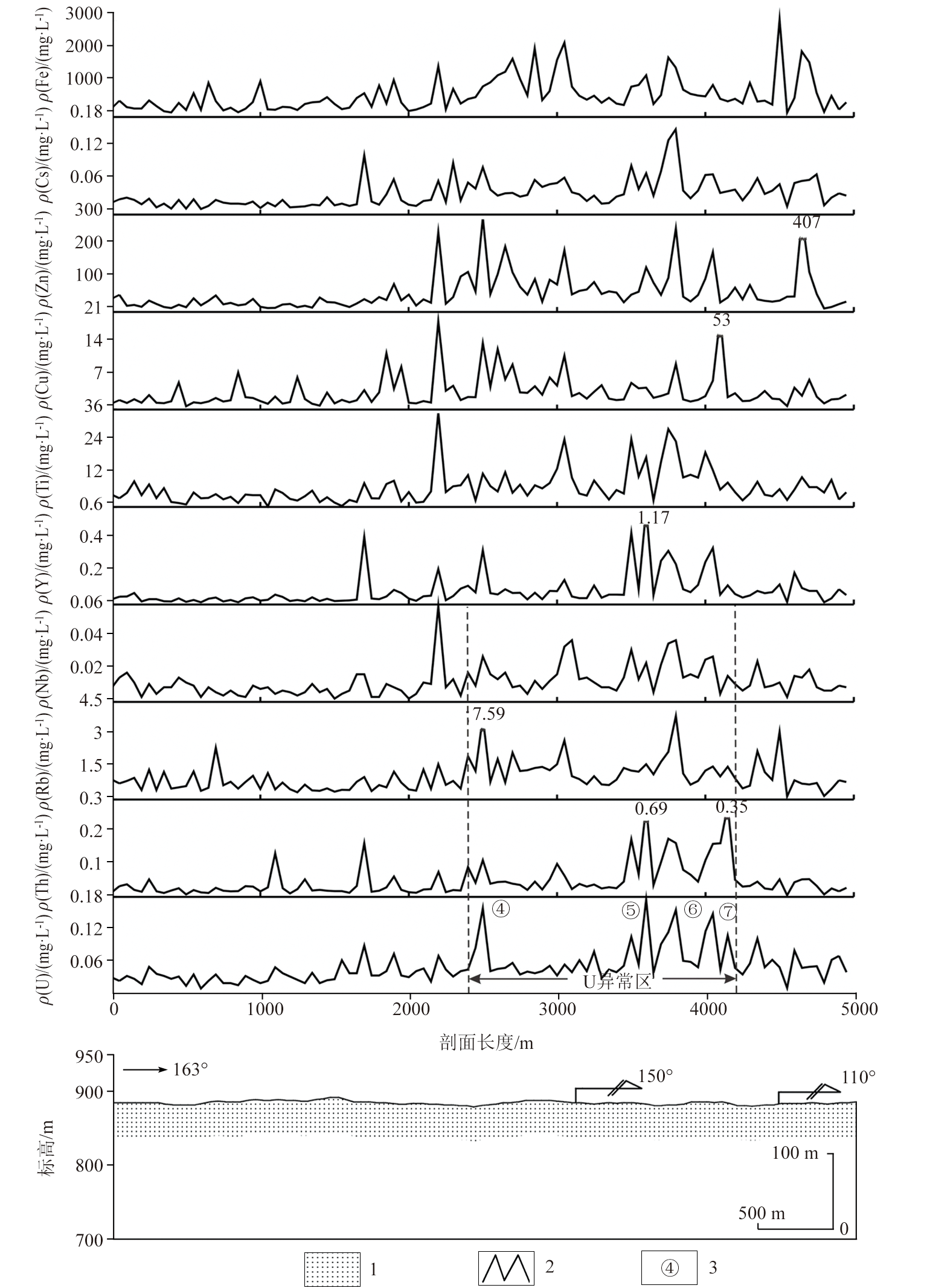 | Fig.8 Comprehensive profile of the main indicator elements on GB survey line by geogas measurement 1—Quaternary aeolian sand; 2—elemental curve of geogas measurement; 3—U content anomaly peaks and numbers |