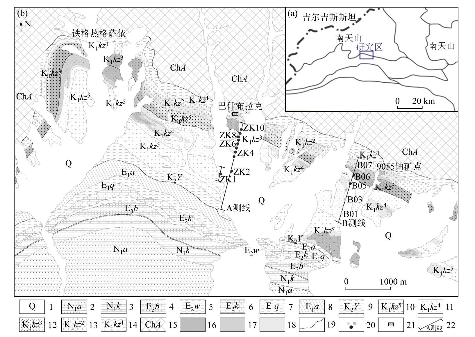 | 图1 研究区位置(a)及地质特征示意(b) 1—第四系;2—安居安组;3—克孜洛依组;4—巴什布拉克组;5—乌拉根组;6—卡拉塔尔组;7—齐姆根组;8—阿尔塔什组;9—英吉沙群;10—克孜勒苏群第一岩性段;11—克孜勒苏群第二岩性段;12—克孜勒苏群第三岩性段;13—克孜勒苏群第四岩性段;14—克孜勒苏群第五岩性段;15—长城系阿克苏群;16—氧化带Ⅰ;17—氧化带Ⅱ;18—氧化带Ⅲ;19—地层界线;20—工业矿孔、矿化孔、无矿孔;21—铀矿床/点;22—地气试验测线 |