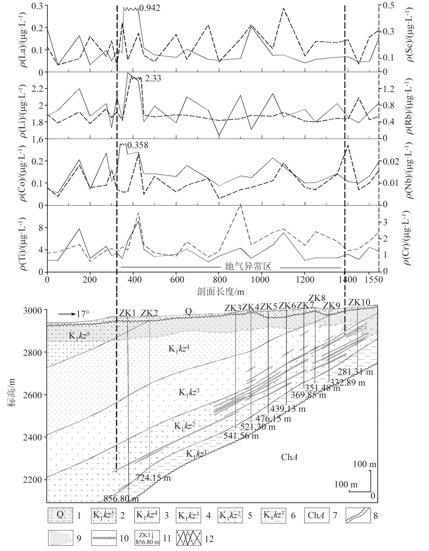 | 图5 A测线地气试验Ti、Cr、Co、Nb、Li、Rb、La、Sc元素剖面 1—第四系; 2—下白垩统克孜勒苏群第五岩性段; 3—下白垩统克孜勒苏群第四岩性段; 4—下白垩统克孜勒苏群第三岩性段; 5—下白垩统克孜勒苏群第二岩性段; 6—下白垩统克孜勒苏群第一岩性段; 7—中元古界阿克苏群; 8—整合界线、角度不整合界线; 9—氧化带; 10—工业矿体、矿化体、异常体; 11—钻孔编号、深度; 12—地气测量曲线 |