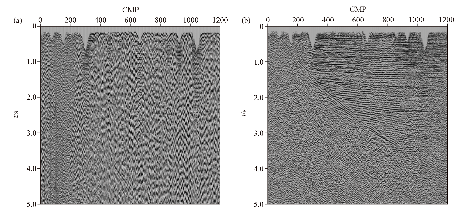 | 图8 测线11噪声压制前(a)后(b)水平叠加剖面效果对比 |