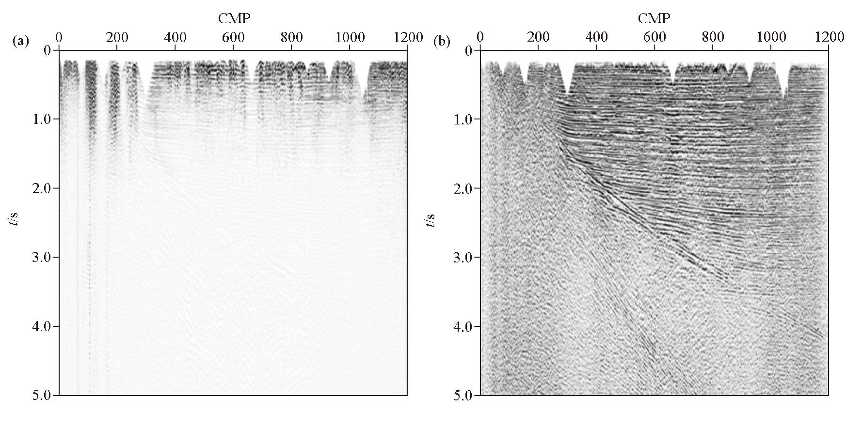 | 图9 测线11振幅一致性处理前(a)后(b)水平叠加剖面效果对比 |
