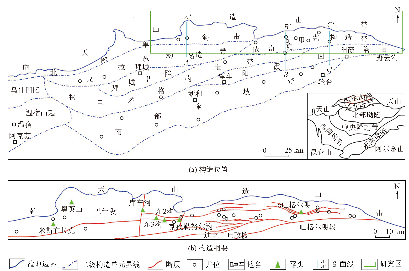 | Fig.1 Structural location (a) and structural outline (b) of the northern tectonic belt of Kuche Depression |
