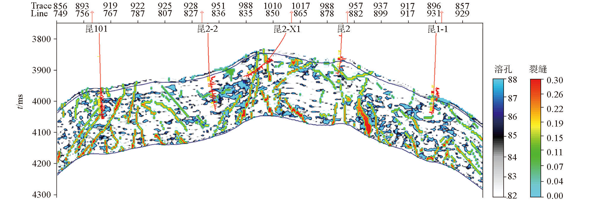 | 图8 过昆101、昆2-2、昆2-X1、昆2、昆1-1井联井孔—缝叠合剖面 |