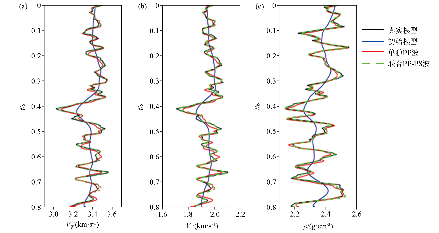 | 图1 单独PP波、联合PP-PS波直接反演纵波速度(a)、横波速度(b)、密度(c) |