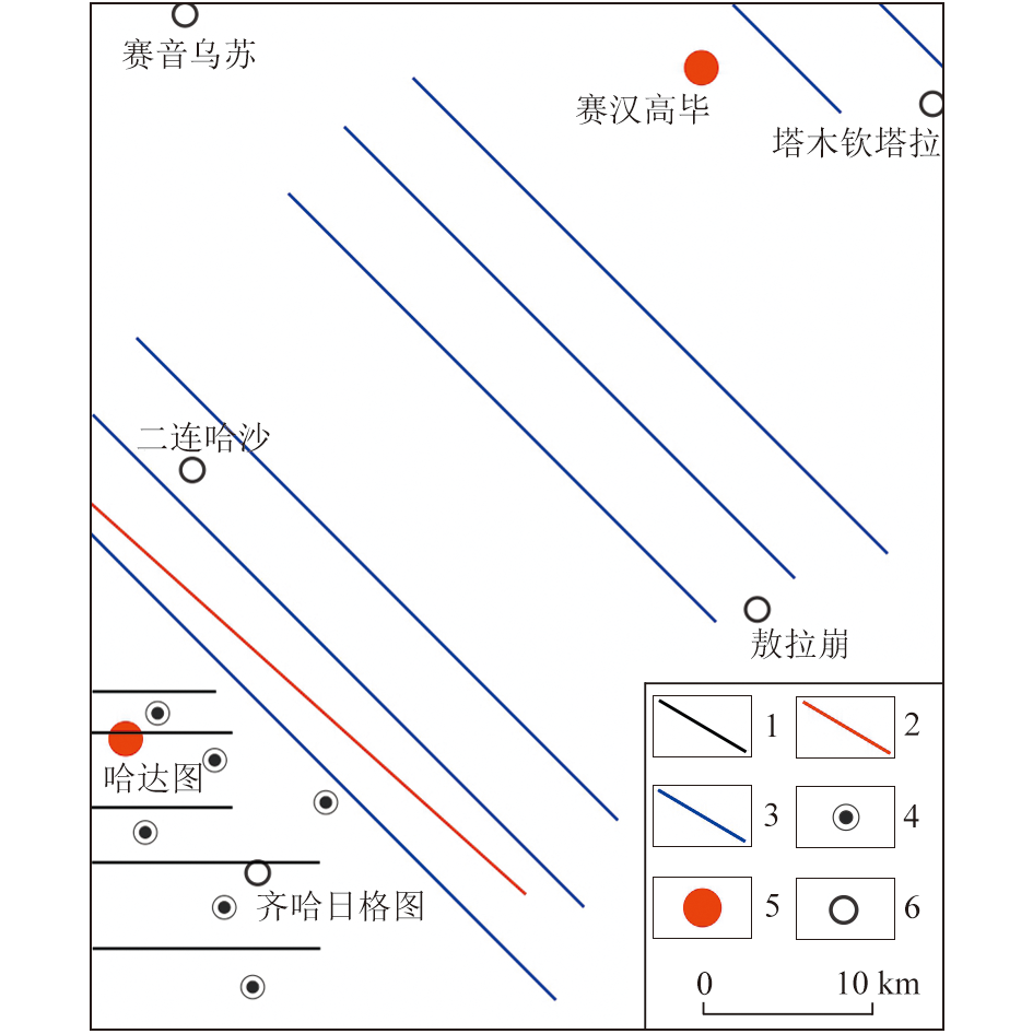 | 图1 研究区以往工作位置 1—地质剖面;2—地震剖面;3—可控源音频大地电磁测量剖面;4—钻孔;5—铀矿床;6—居民点 |