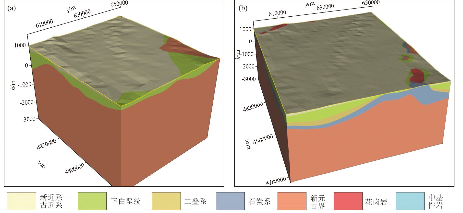 | Fig.2 3D geological model of the study area (with z-axis-stretched 10 times, the same below) a—preliminary 3D geological model; b—final 3D geological model |