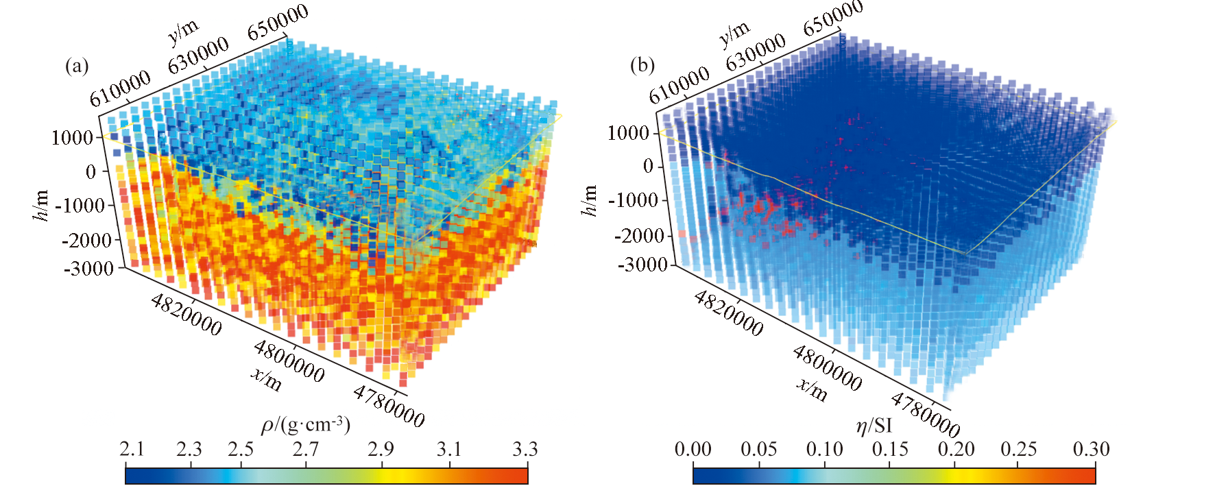 | 图4 重磁三维联合反演结果 a—密度;b—磁化率 |