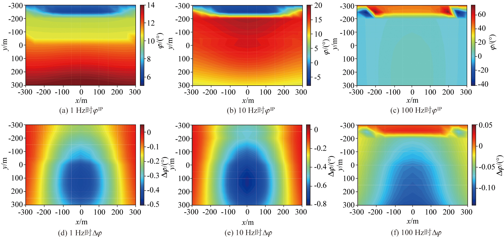 | 图5 含激电矿体模型的不同频率电场相位φIP及相对不含激电矿体模型电场相位φNoIP的变化量Δφ |