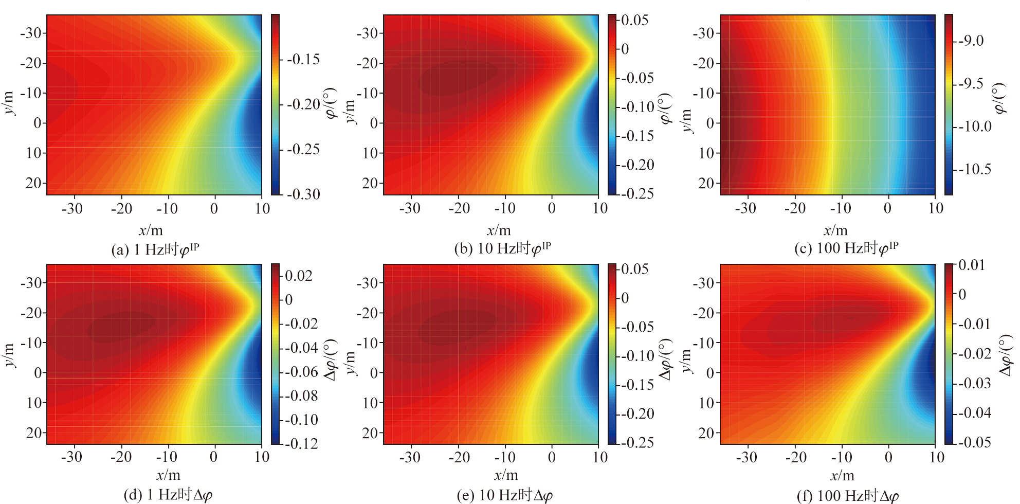 | 图9 含激电渗漏模型的不同频率电场相位φIP及相对不含激电矿体模型电场相位φNoIP的变化量Δφ |