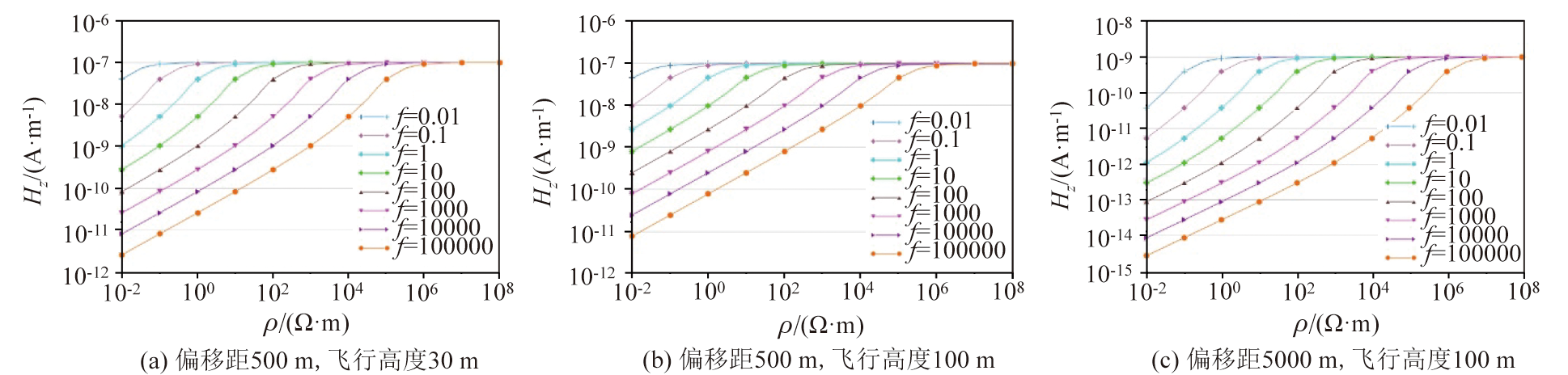 | 图4 均匀半空间下磁场强度Hz响应随模型电阻率变化 |