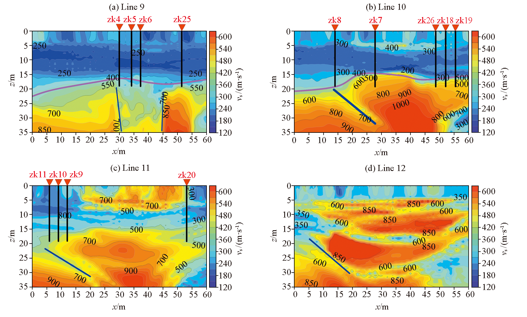 | 图12 L9~L12测线横波速度剖面 |