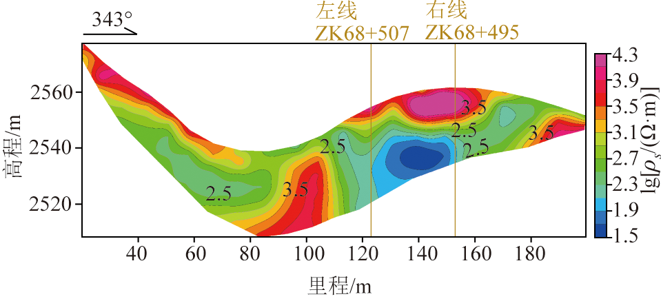 | Fig.3 High-density apparent resistivity profile at ZK68+507 (WS-037) for the left line of the Dafengding tunnel |