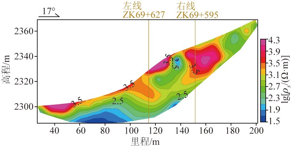 | Fig.5 High-density apparent resistivity profile at ZK69+627 (WS-039) for the left line of the Dafengding tunnel |