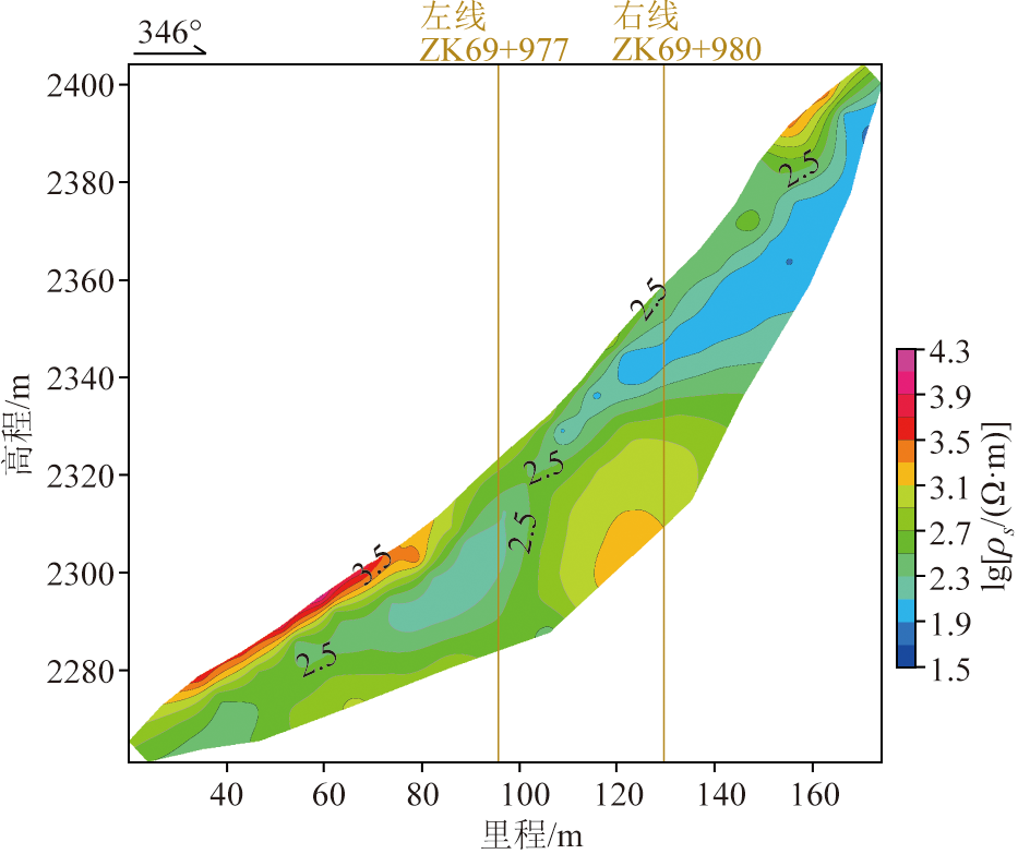 | Fig.6 High-density apparent resistivity profile at ZK69+977 (WS-040) for the left line of the Dafengding tunnel |