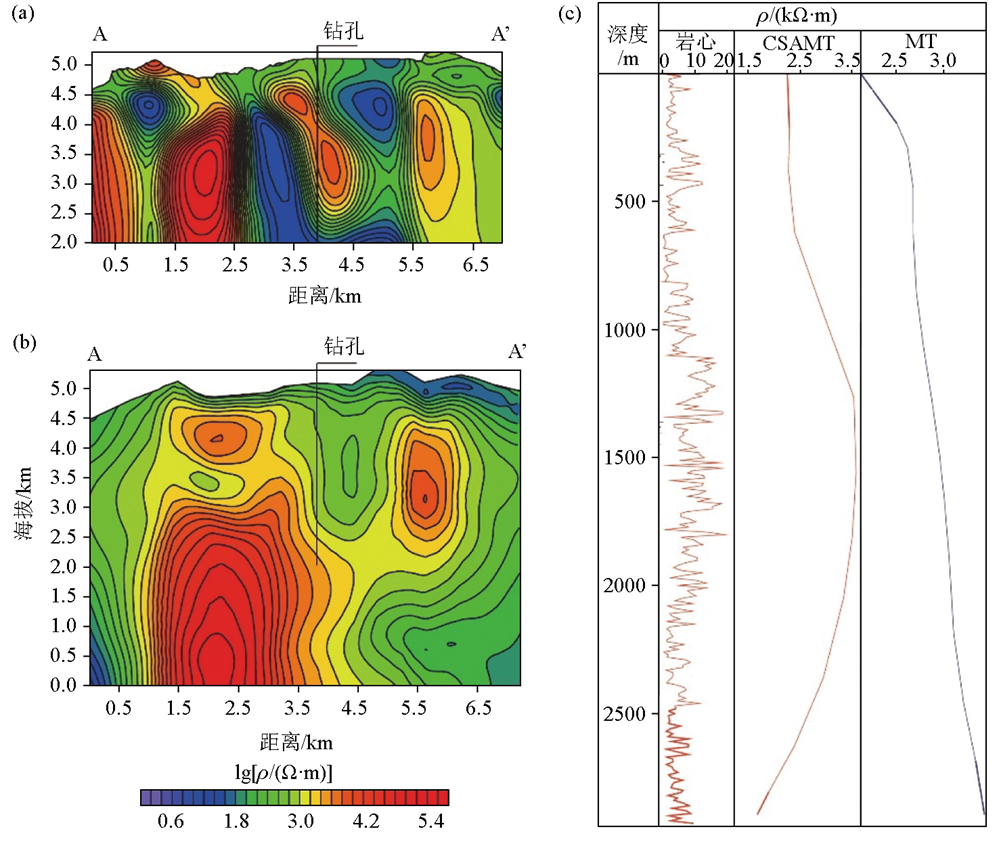 | 图4 大功率张量CSAMT和MT二维剖面结果对比[ a—大功率张量CSAMT二维反演结果;b—MT结果;c—岩心测量结果与张量CSAMT、MT的对比 |
