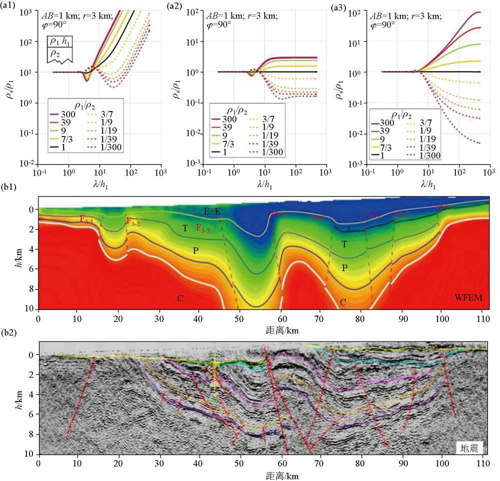 | 图6 WFEM与CSAMT一维数值模拟(a)及地震勘探应用效果(b)的对比[ a1—CSAMT一维数值模拟结果;a2—WFEM的Ex分量一维数值模拟结果;a3—WFEM的Hy分量一维数值模拟结果;b1—为WFEM应用效果;b2—地震成像结果 |