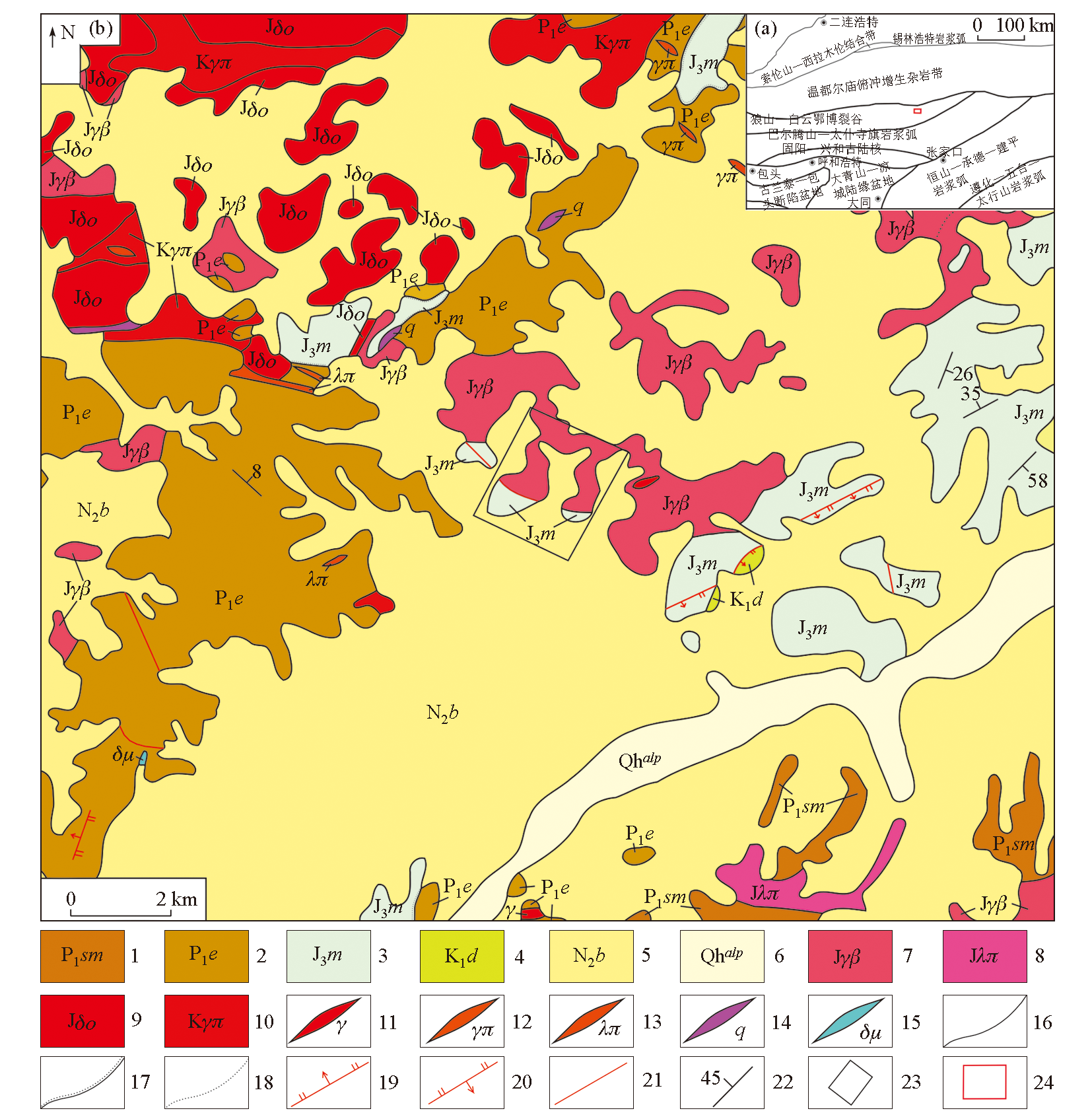 | Fig.1 Geotectonic location (a) (revised by Liu et al.[ 1—lower Permian Sanmianjing Formation;2—lower Permian Elitu Formation;3—upper Jurassic Manketouebo Formation;4—lower Cretaceous Damoguaihe Formation;5—Pliocene Baogedawula Formation;6—Holocene sand and gravel;7—Jurassic biotite granite;8—Jurassic biotite quartz porphyry and quartz porphyry;9—Jurassic biotite quartz diorite;10—Cretaceous granite porphyry;11—granite vein;12—granite porphyry vein;13—granitic pegmatite vein;14—quartz vein;15—diorite porphyrite vein;16—measured geological boundary;17—measured angular unconformity boundary;18—measured lithofacies zone boundary;19—measured normal fault;20—measured reverse fault;21—measured fault of unknown kinematics;22—bedding attitude;23—study area;24—schematic location of Fig.b in Fig.a |