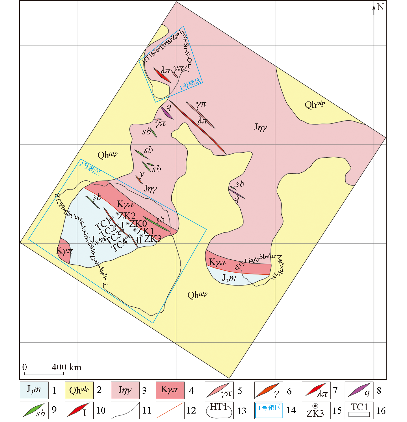 | 图2 毕山研究区地质简图及综合异常 1—上侏罗统满克头鄂博组;2—全新统砂砾石;3—侏罗纪细粒二长花岗岩;4—白垩纪花岗斑岩;5—花岗斑岩脉;6—花岗岩脉;7—流纹斑岩脉;8—石英脉;9—矿化蚀变带;10—矿体位置及编号;11—地质界线;12—实测断层;13—综合异常区及编号;14—找矿靶区及编号;15—钻孔位置及编号;16—探槽位置及编号 |