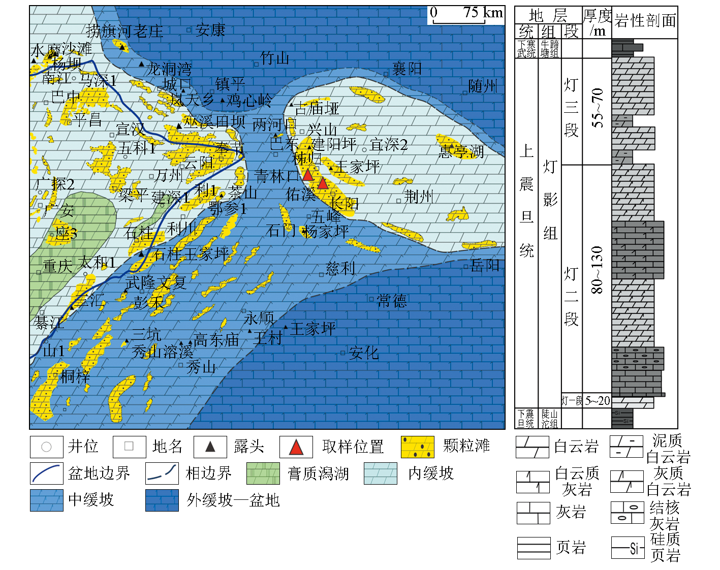 | 图1 研究区灯影期沉积相及灯影组地层柱状图(据李文正等[ |